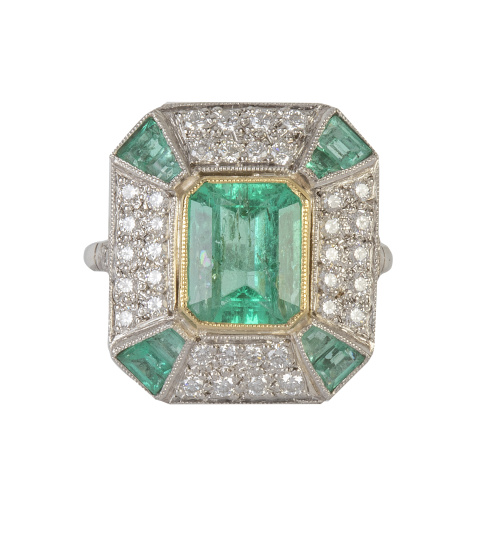 Sortija estilo Art-Decó con emeralda central de 2 ct aprox, en marco octogonal cuajado de brillantes con esmeraldas talla trapecio