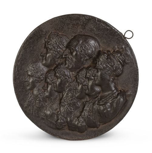 Medallón de hierro fundido con la Familia Real de Carlos IV de perfil.