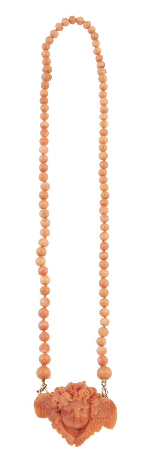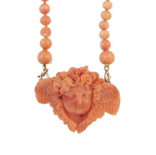 Collar italiano de coral S.XVIII-XIX con centro de broche tallado en figura de putti e hilo de cuentas de coral