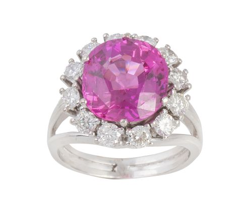 143. Sortija con zafiro rosa sintético oval central orlada de brillantes en montura de garras