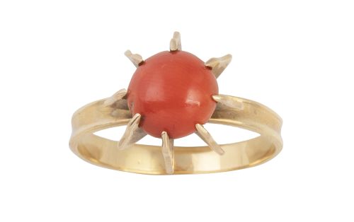 158. Sortija con cabuchón de coral engastado en ocho grandes garras