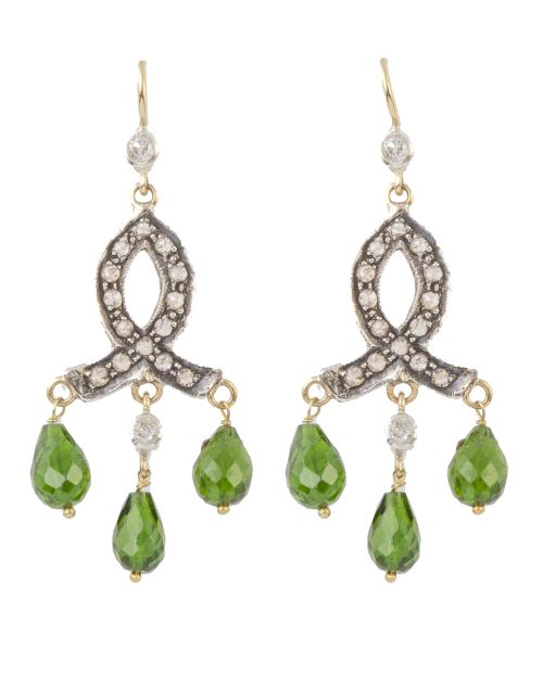 198. Pendientes largos con perillas facetadas de peridotos colgantes de lazo de diamantes y brillante en chatón superior