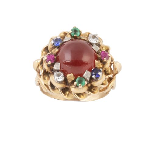 Sortija años 50 con cabujón de cornalina en centro móvil orlado de orlado de piedras de diferentes colores