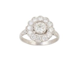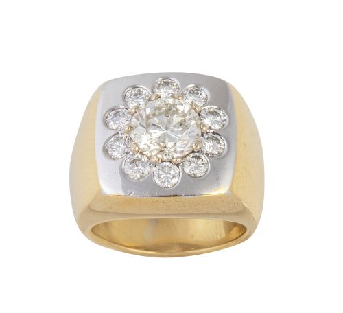 Sortija tipo sello cuadrada con rosetón de brillantes engastado en el centro, con un brillante principal de 0,50 ct