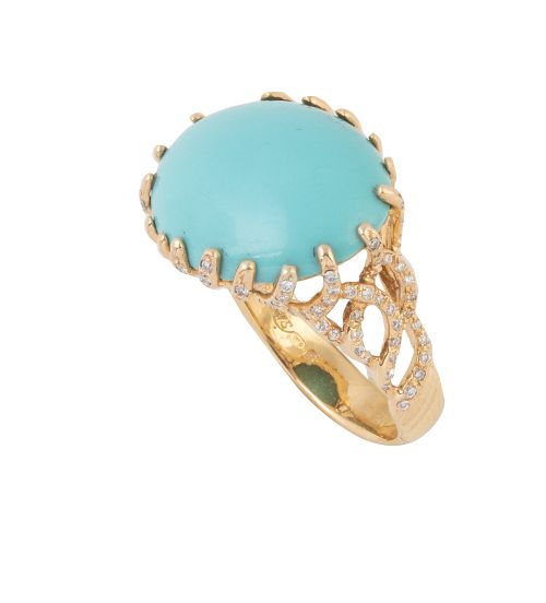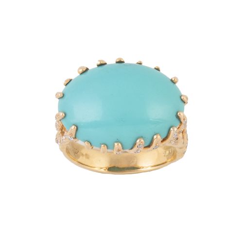 Sortija con cabujón oval de turquesa en montura de garras decoradas con brillantes, con brazos de la montura calados y cuajados de brillantes