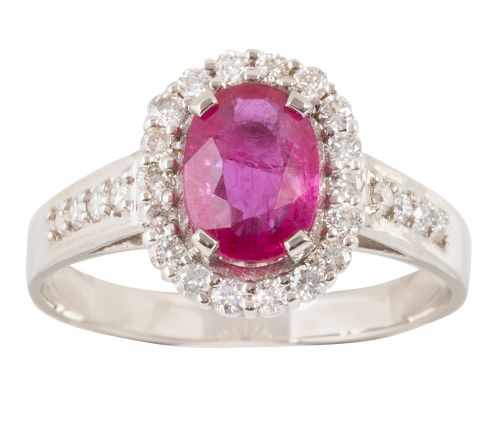 Sortija con rubí oval central de 1,72 ct aprox orlado de brillantes, con brillantes decorando los brazos de la montura