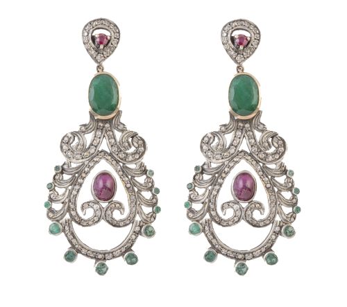 252. Pendientes largos con diseño de pluma de pavo real de diamantes adornados con rubíes y esmeraldas