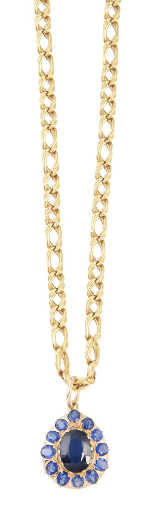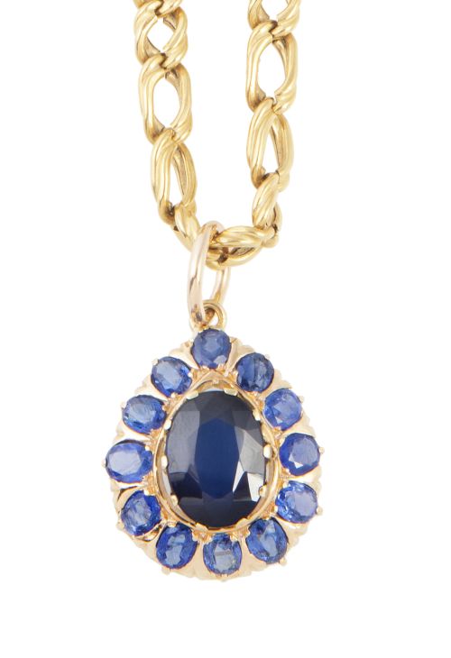 Colgante de zafiros con diseño de gota, con un zafiro oval cental de 8,19 ct orlado de zafiros, que pende de cadena barbada de oro