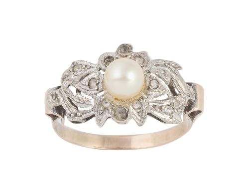 Sortija de pp. S. XX con símil perla central sobre hojitas de plata
