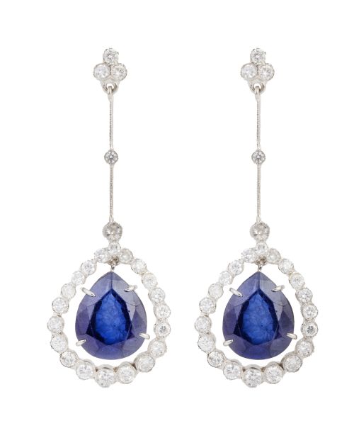 272. Pendientes largos estilo Art-Decó con zafiro talla pera en marco de chatones de brillantes, que pende de barritas articuladas con brillantes
