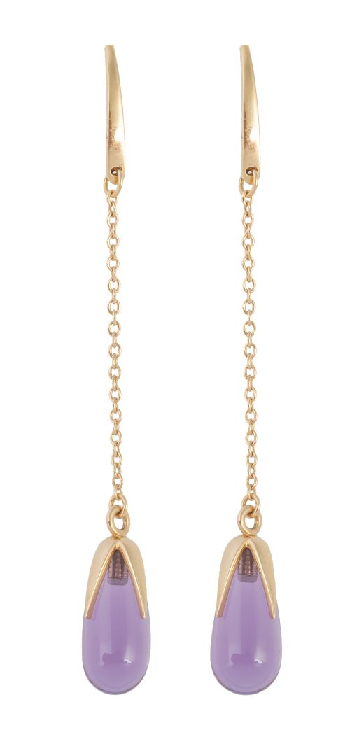 Pendientes largos con amatista gota que pende de cadena fina de oro y gancho superior
