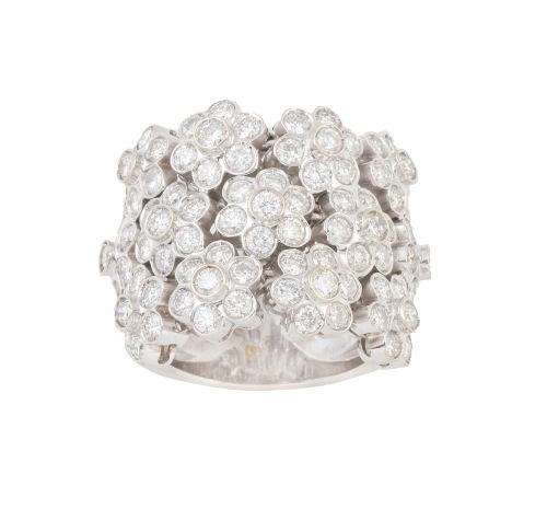 306. Sortija ancha de brillantes con tres bandas de flores de rosetones de brillantes