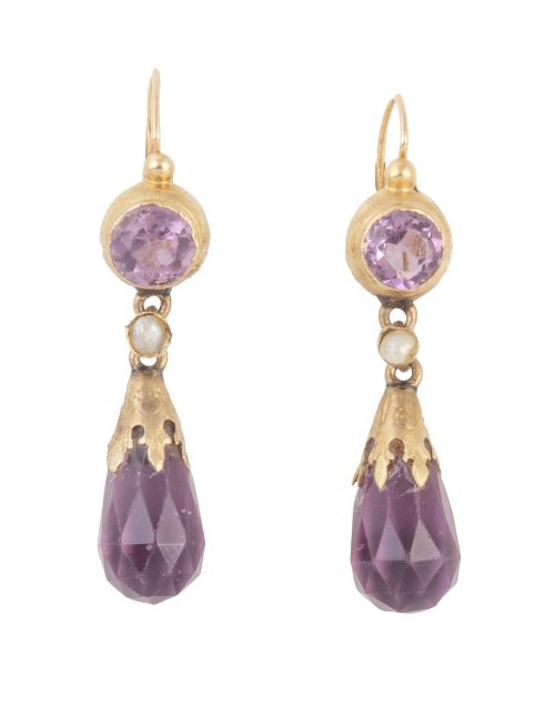 Pendientes largos S. XIX con perilla colgante y botón de cristal malva