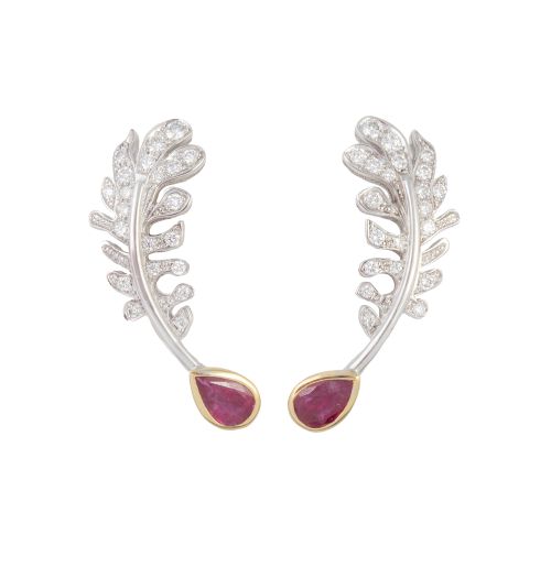 Pendientes con diseño de pluma de brillantes con rubí talla pera colgante