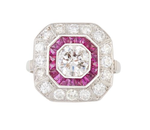 318. Sortija estilo Art-Decó cuadrada con brillantes y rubíes en ojo de perdiz central de 0,90 ct aprox, con orla exterior octogonal de brillantes