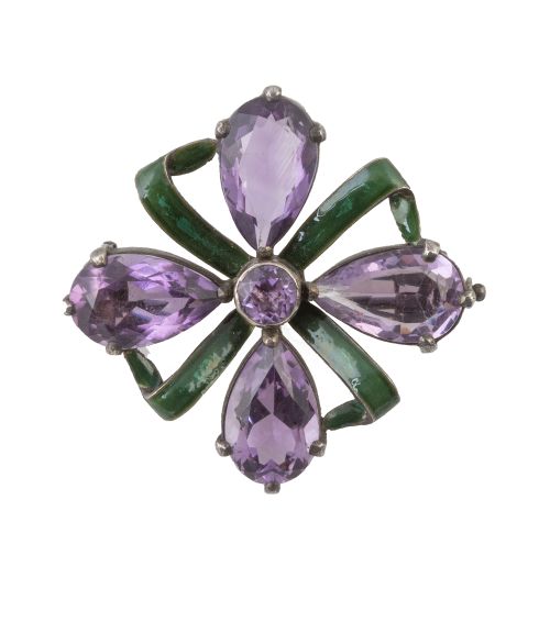 33. Broche flor de pp. S. XX con pétalos de amatistas facetadas y hojas de esmalte verde