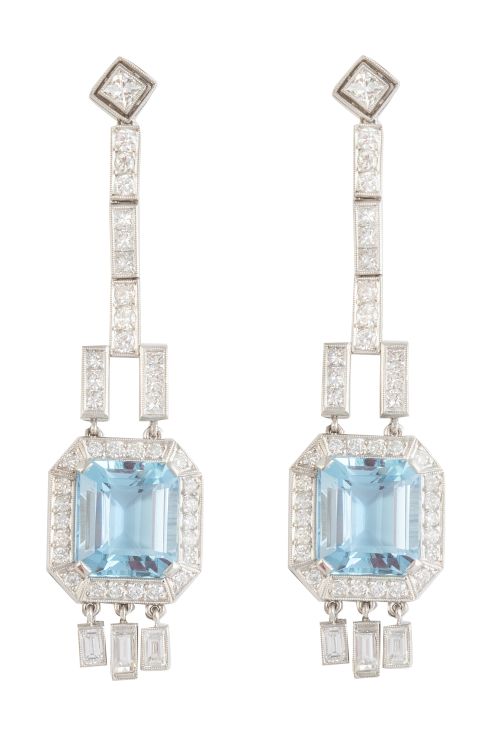 Pendientes largos de aguamarinas y brillantes estilo Art-Decó,con línea de brillantes de la que pende aguamarina talla esmeralda y tres brillantes talla baguette colgantes
