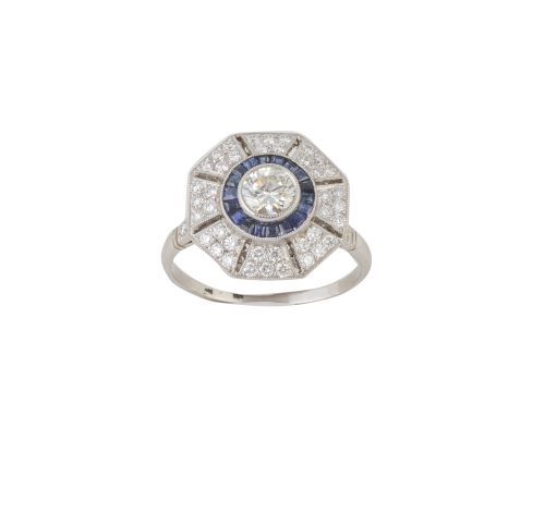 Sortija ocotogonal estilo Art-Decó con centro de ojo de perdiz orlado de zafiros calibrados con banda exterior cuajada de brillantes