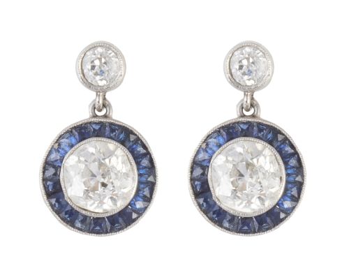 Pendientes ojo de perdiz con brillante central de 0,90 ct aprox, orlado de zafiros calibrados, que pende de chatón de brillante