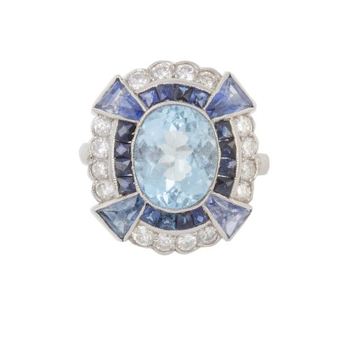 Sortija oval con aguamarina en marco de zafiros calibrados y brillantes estilo Art-Decó
