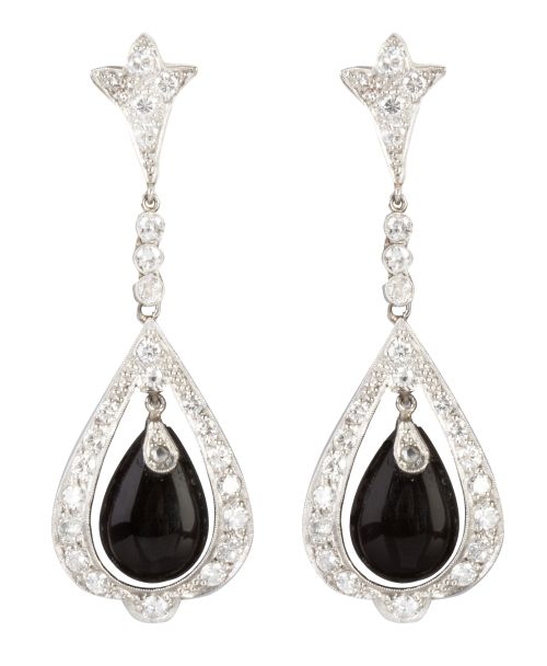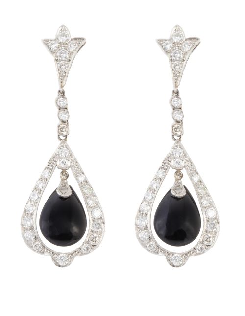 377. Pendientes largos estilo Art-Decó de brillantes, con diseño de lágrima de la que pende ónix talla gota