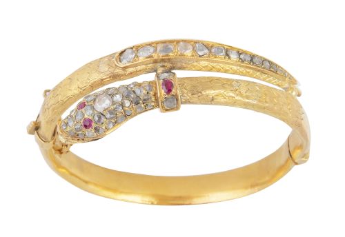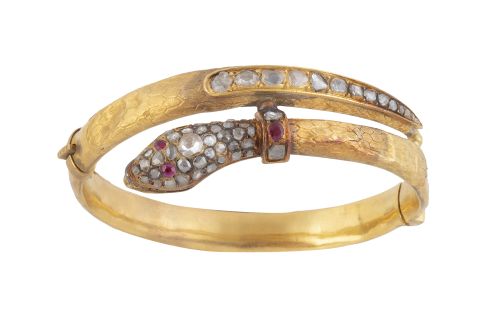 4. Brazalete rígido c. 1830 en diseño de serpiente, con cabeza cuajada de diamantes, ojos de rubíes y banda de diamantes de talla rosa de tamaño creciente en cola