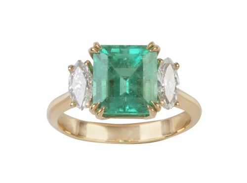 Sortija con esmeralda colombiana central de 3,30 ct flanqueado por dos diamantes talla marquisse