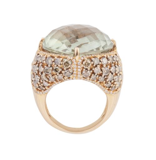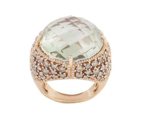 421. Sortija con gran aguamarina facetada central y montura cuajada de brillantes brown que componen cuatro lóbulos