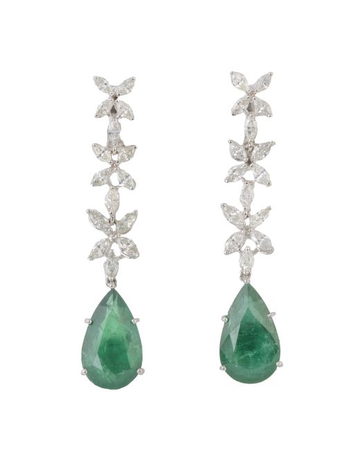 423. Pendientes largos con esmeraldas talla pera colgantes de tres flores de brillantes talla marquisse