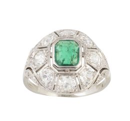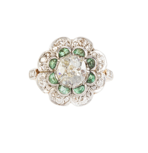 Con orla de esmeraldas calibradas, y orla exterior de brillantes y diamantes en marco lobulado a modo de pétalos.