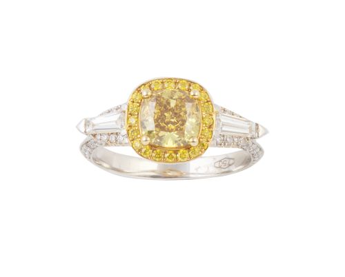 Sortija con diamante Fancy talla cushion de 1,50 ct flanqueado por diamantes talla baguette, y con brillantes decorando la montura y los brazos de engaste