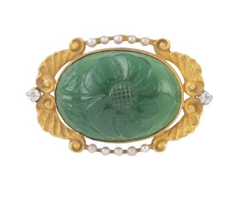 Broche de pp. S. XX con flor tallada en cabuchón de calcedonia, con perlas finas y brillantes de talla antigua adornando marco con remates de rocalla en oro mate