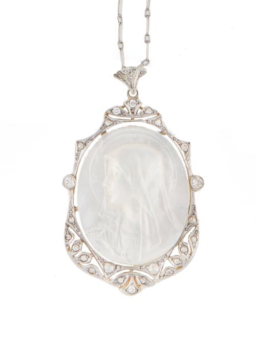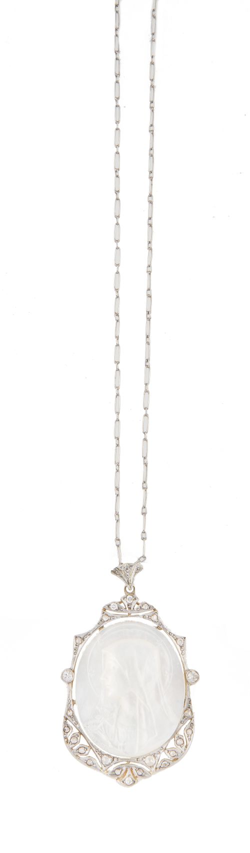 Medalla colgante Art-Decó con Virgen sosteniendo narciso tallada en nácar, rodeada por marco calado y cuajado de diamantes