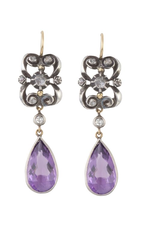 Pendientes largos de pp. S. XX con perillas de amatistas colgantes de pieza calada de diamantes
