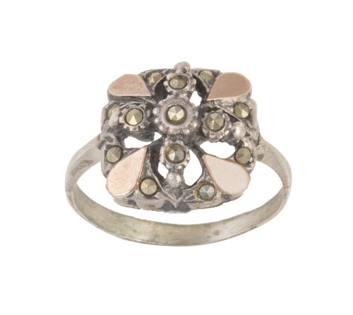73. Sortija portuguesa Art-Decó con maracasitas y aplicaciones de oro en frente cuadrado calado
