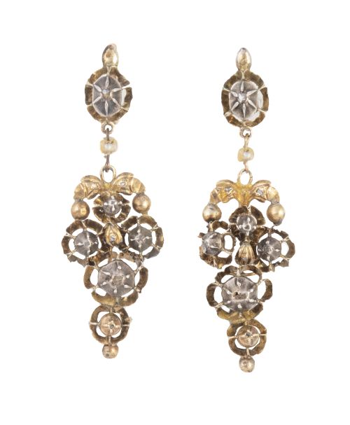 9. Pendientes largos S. XIX compuestos por rosetones con decoración calada y diamantes?