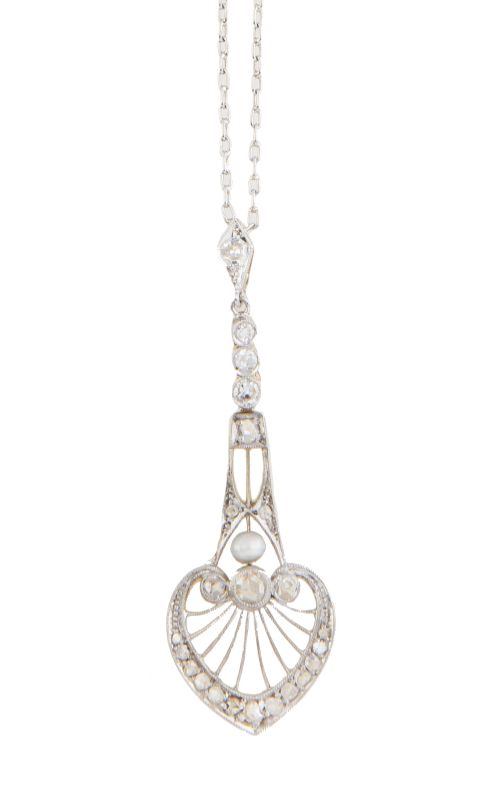 90. Pendentif Belle-Époque de diamantes y perla fina con diseño de punta de flecha redondeada calada