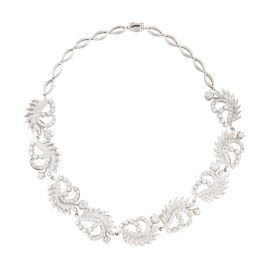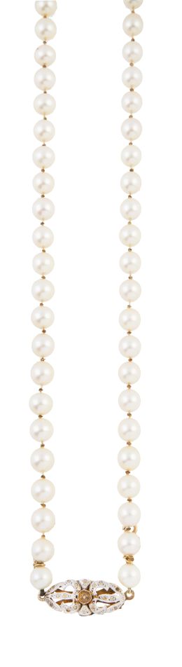 98. Colgante de perilla de perla australiana con capuchón de brillantes, y cadena de perlas y platino
