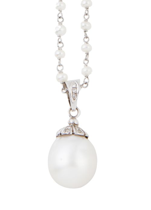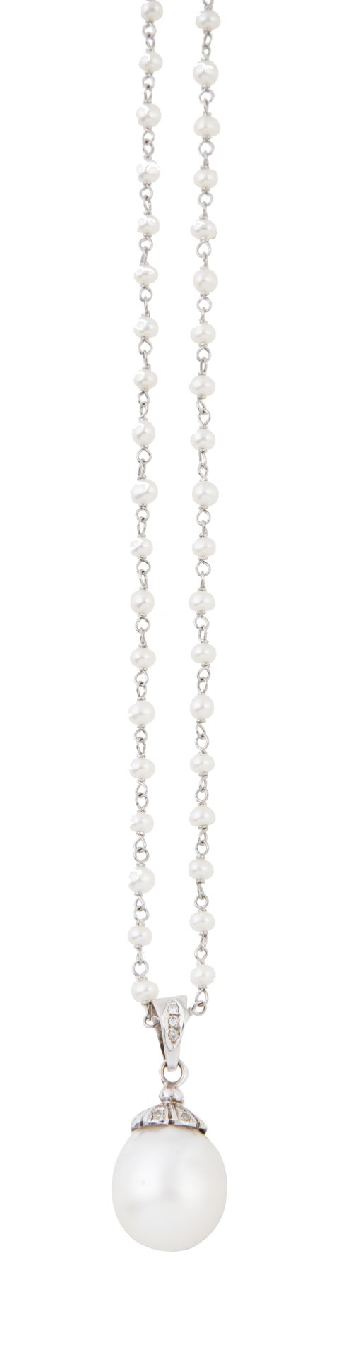 Colgante de perilla de perla australiana con capuchón de brillantes, y cadena de perlas y platino