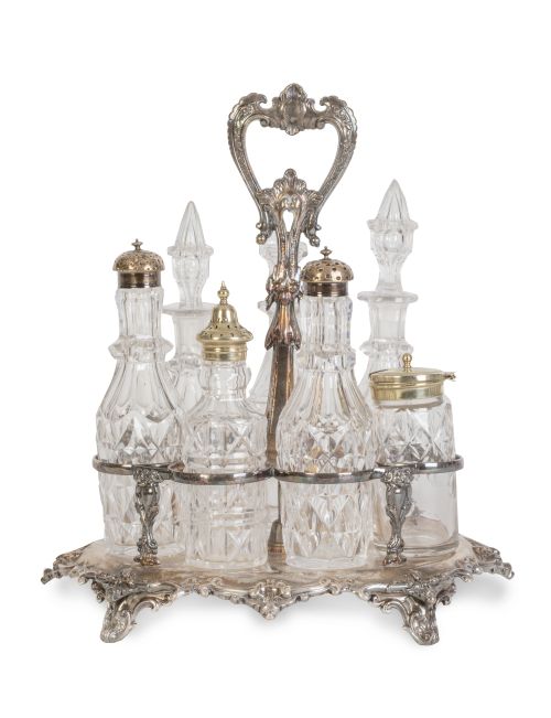 1357. Recado de vinagreras de metal plateado con con siete frascos de cristal tallado.