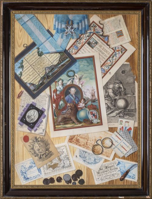 Mesa revuelta de grabados, manuscritos, monedas y gafas, incluyendo el retrato de Carlos II