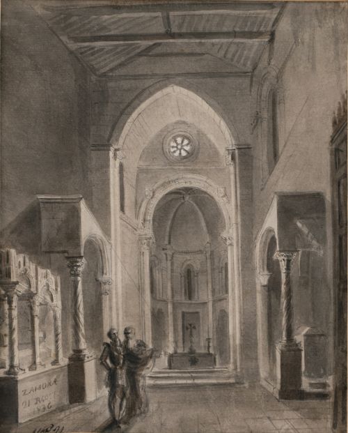 Dibujo de La Iglesia de la Magdalena, en Zamora. Primero de la Orden del Temple, y después de la de San Juan de Jerusalén, que fue utilizado por Villaamil como base la realización de la estampa incluida en el Tomo II, cuadernos 3º, estampa 1; recogida en el tomo II de La España Artística y Monumental: Vistas y Descripción de los Sitios más Notables de España.