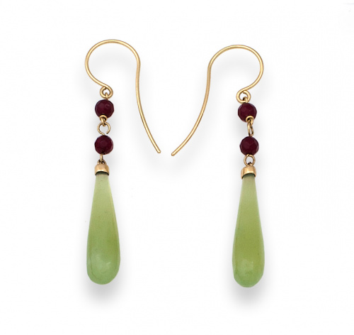 Pendientes largos perillas de jade natural y cuentas de granates.