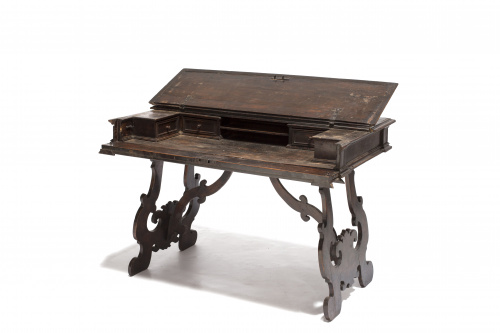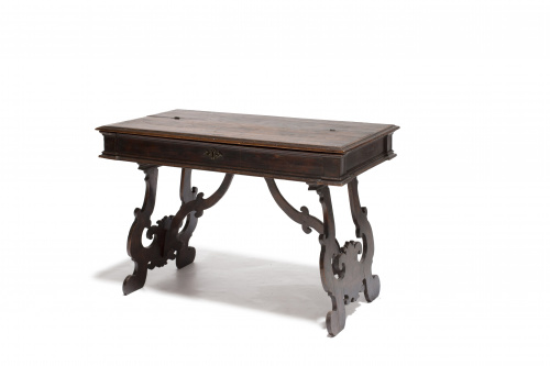 367. “Scrivania” en madera de nogal, sobre patas de lira en esviaje. Trabajo Italiano. S.XVII.