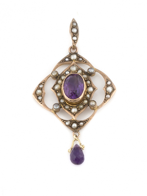 11. Colgante de pp. S.XX con amatistas y perlas finas en diseño de rombo calado con amatista briolette colgante