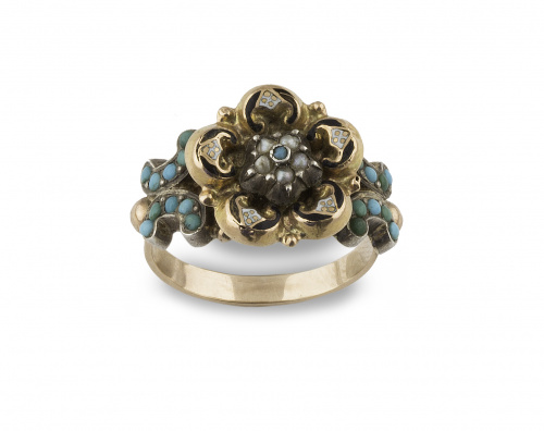 Sortija flor S.XIX con turquesa, esmalte y perlitas en oro amarillo de 14K. La flor tapa cavidad secreta interna