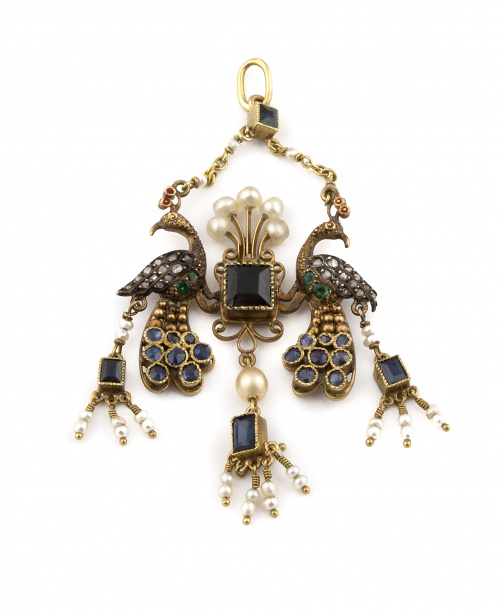 16. Delicado colgante S.XIX con pavos reales de diamantes, esmeraldas y zafiros, flanqueando zafiro encabezado por abanico de perlas. Cada pieza con racimos colgantes de perlas de aljófar