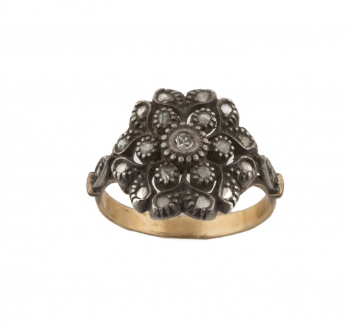Sortija flor de diamantes de ff. S.XIX en oro amarillo de 19K. con frente de engaste en plata