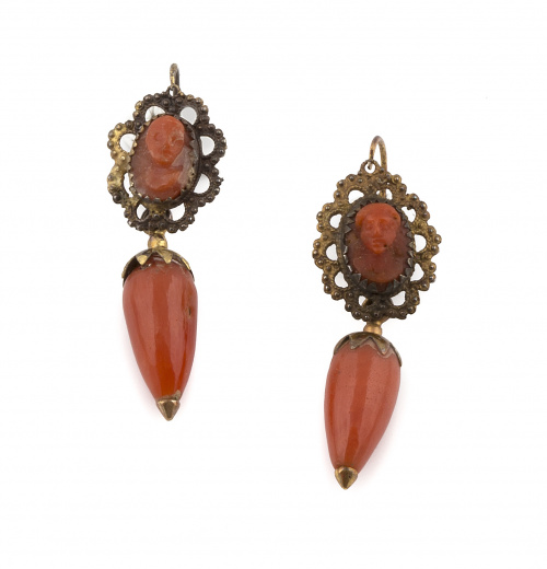 26. Pendientes largos de coral S.XIX con camafeos y perillas colgantes; los camafeos enmarcados en filigrana de oro