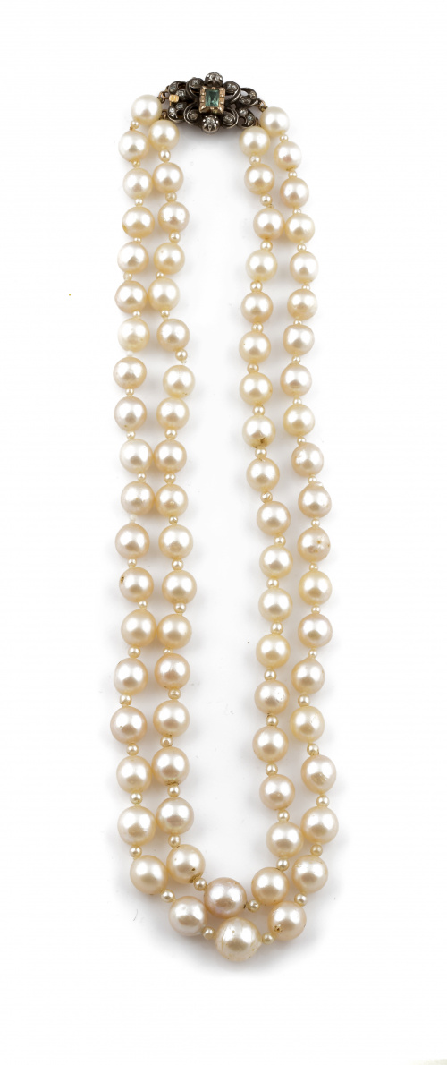 32. Collar de dos hilos de perlas cultivadas alternas con pequeñas perlas; con cierre isabelino de esmeralda y diamantes en oro de 18K. con frente en plata